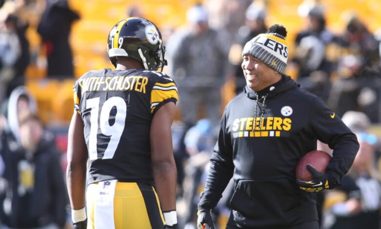 Steelers wide receiver JuJu Smith-Schuster (19) talks with former receiver Hines Ward before playing the Jaguars in the 2018 AFC Divisional Playoff game / © Charles LeClaire-USA TODAY Sports