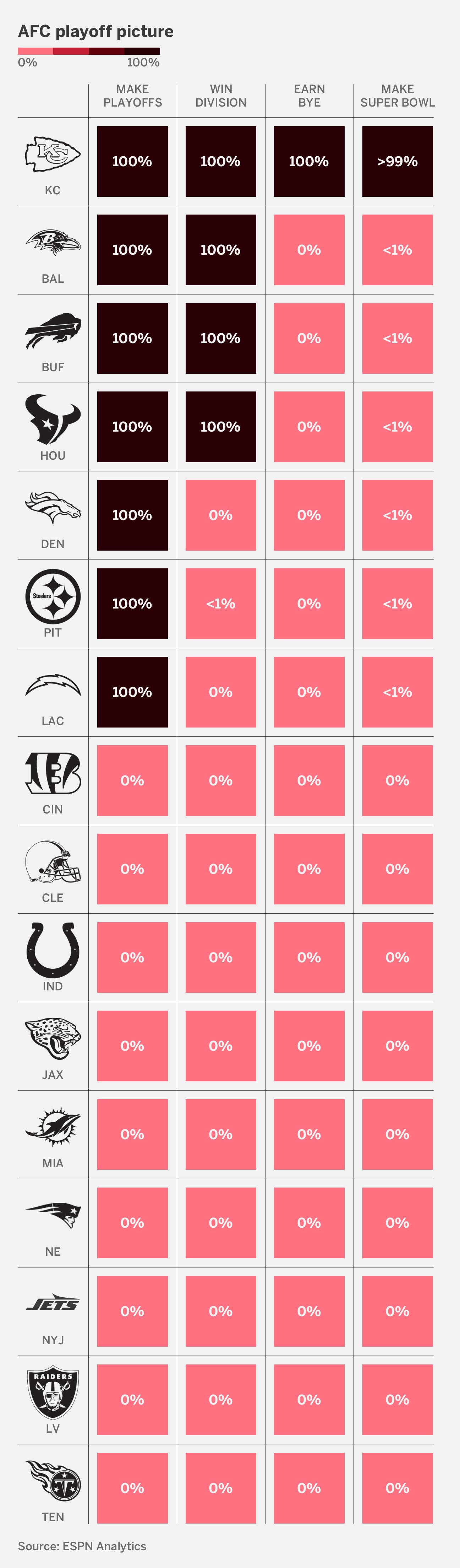The Chiefs, Bills and Texans have all clinched their respective division titles, and the Steelers, Ravens and Chargers are also officially in the playoffs.