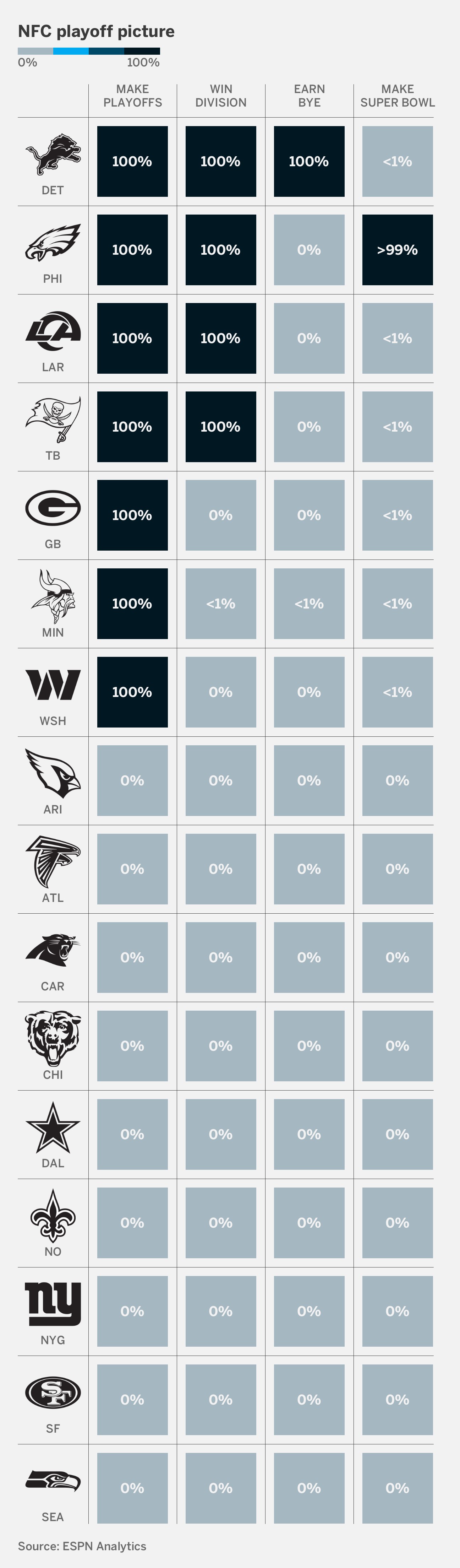 The Lions, Eagles, Vikings, Packers, Commanders and Rams have all clinched spots in the playoffs. The final spot will be the winner of the NFC South — either the Buccaneers or Falcons.