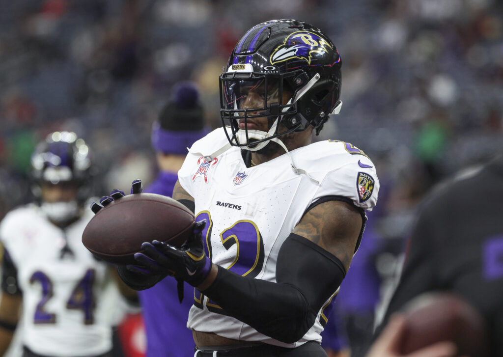 Dec 15, 2024; Houston, Texas, USA; Baltimore Ravens running back Derrick Henry (22) warms up before the game against the Houston Texans at NRG Stadium. Mandatory Credit: Troy Taormina-Imagn Images