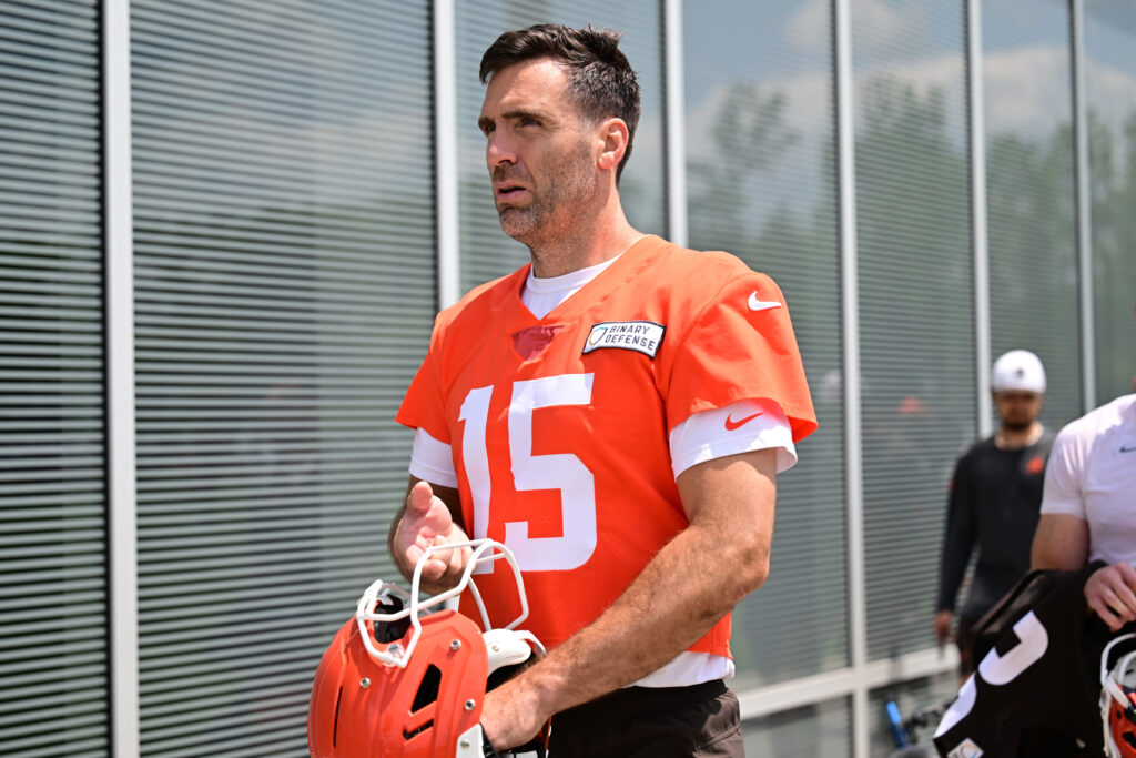 Jun 10, 2025; Berea, OH, USA; Cleveland Browns quarterback Joe Flacco (15) walks off the field during minicamp at CrossCountry Mortgage Campus. Mandatory Credit: Ken Blaze-Imagn Images