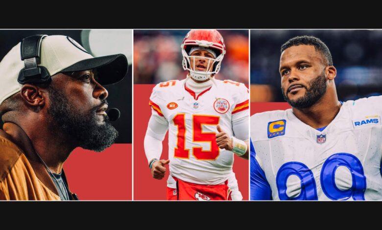 photos of Mike Tomlin, Patrick Mahomes and Aaron Donald