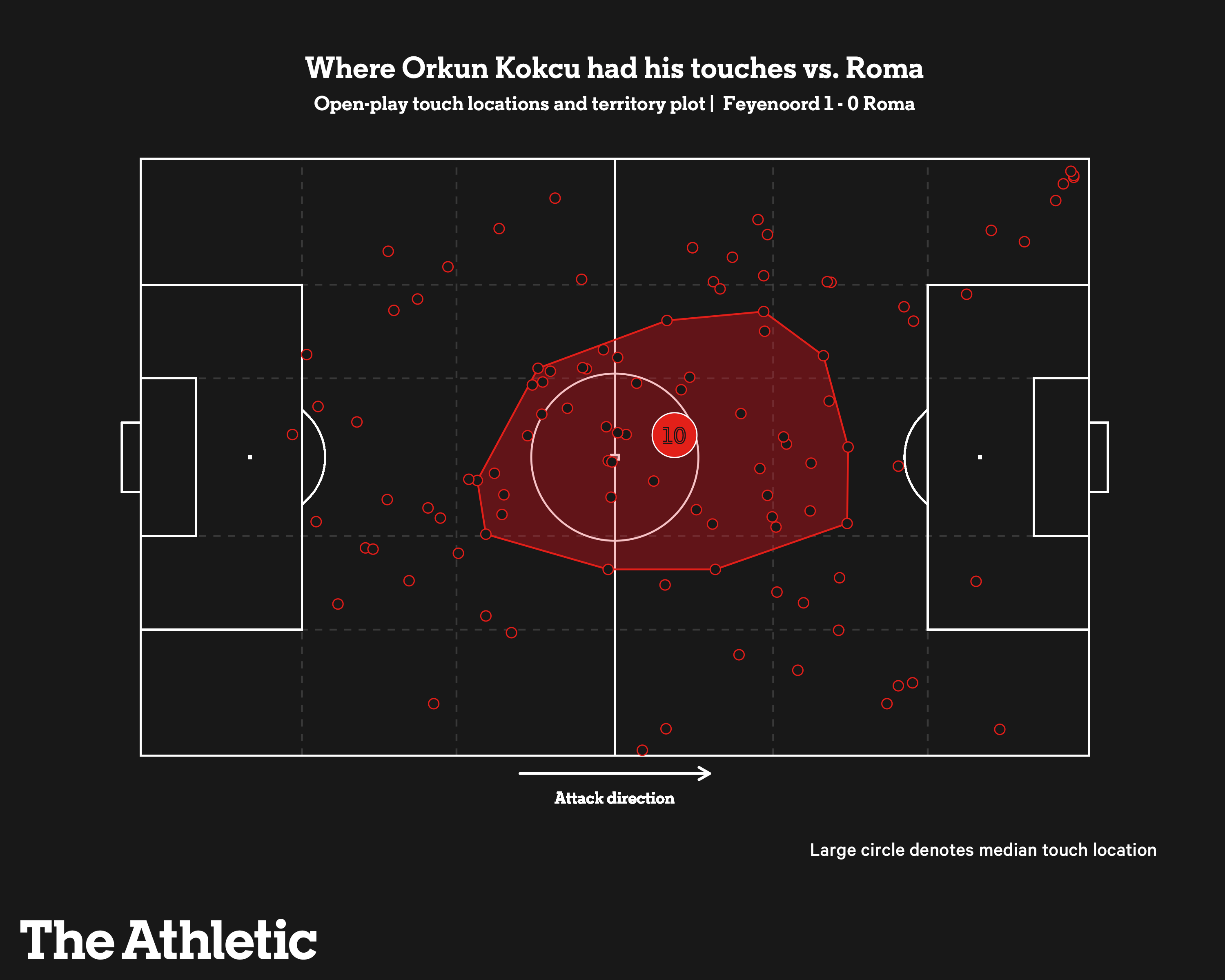 To illustrate this point, take a look at this touch chart for Kokcu in Feyenoord’s Europa League quarter-final first-leg victory over Roma in April 2023. The concentration is in the middle, but there are very few areas of the pitch he did not cover.