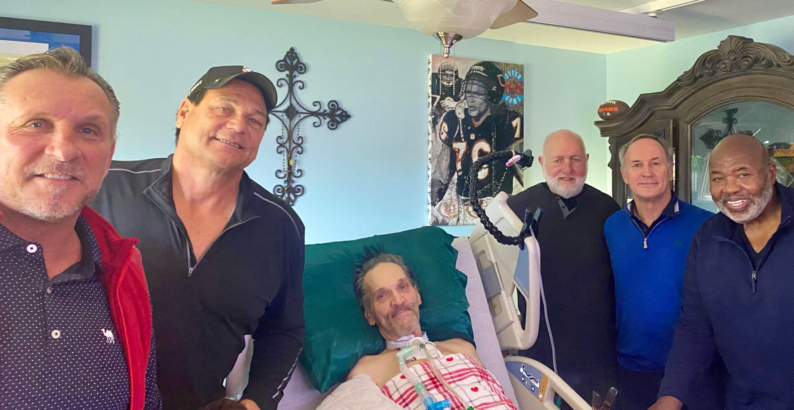 Former Bears teammates, from left, Jim Thornton, Dan Hampton, Mike Hartenstine, Gary Fencik and Jim Osborne surround Steve McMichael, center. (Courtesy of John Nunu Zomot)