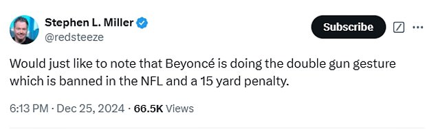 ‘Would just like to note that Beyoncé is doing the double gun gesture which is banned in the NFL and a 15 yard penalty,’ one NFL said.