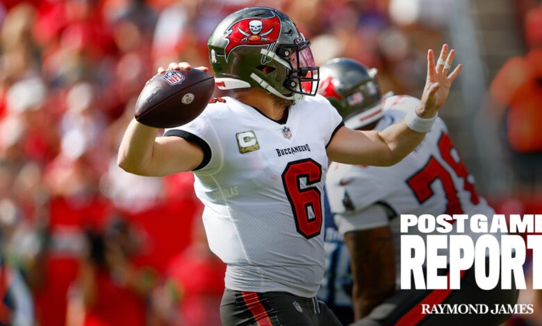 The Bucs ran it three times to bring the clock down to the two-minute warning, then punted again, with Camarda’s low kick taken out of bounds at the 21. A couple of underneath completions got the ball to the 34 but also took a minute off the clock. The Titans’ next four passes were incomplete and the Bucs kneeled once to run out the final seconds.