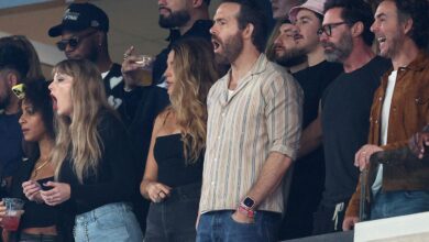 EAST RUTHERFORD, NEW JERSEY – OCTOBER 01: (L-R) Singer Taylor Swift, Actor Ryan Reynolds and Actor Hugh Jackman cheer prior…