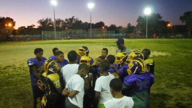 Mo Better Jaguars’ coaches and players huddle at the end of practice at Betsy Head Park in Brownsville, Brooklyn in…