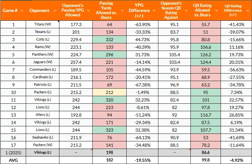 Last year, the Bears had a strong pass defense (13th in DOVA) that seemed to fall apart a bit by the end of the season.