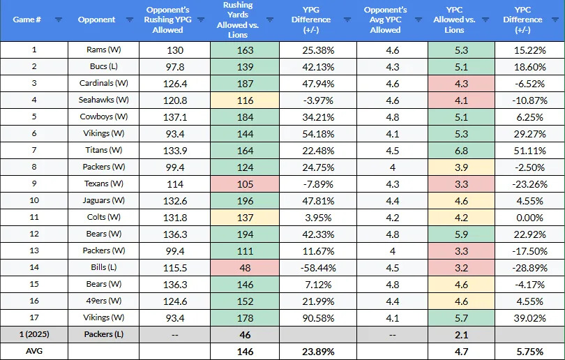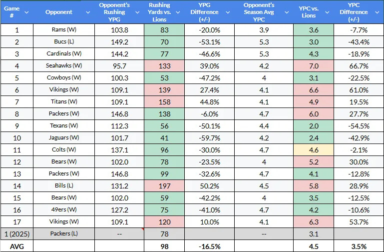 Although again, we have to give some credit to the Packers’ defense. On Thursday, they held the Commanders to just 51 rushing yards on 19 carries—a 2.7 yards per carry average. Against the Giants, Washington had the second-best rushing performance of Week 1: 220 yards and 6.9 yards per carry. So… maybe the inverse happens to the Lions?