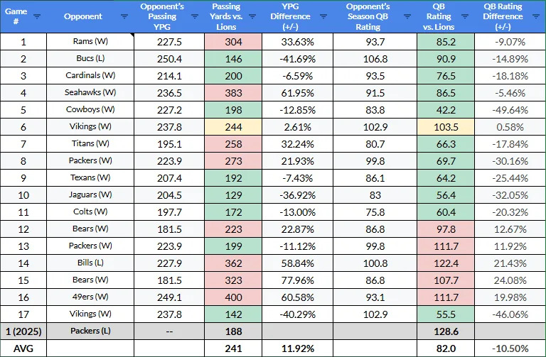 The Lions weren’t exactly gashed through the air against the Packers, allowing just 188 yards. However, Jordan Love only attempted 22 passes in that game. Had Green Bay needed to be more aggressive in the second half, it could’ve looked worse. By efficiency metrics, it wasn’t a great day for the Lions’ pass defense:
