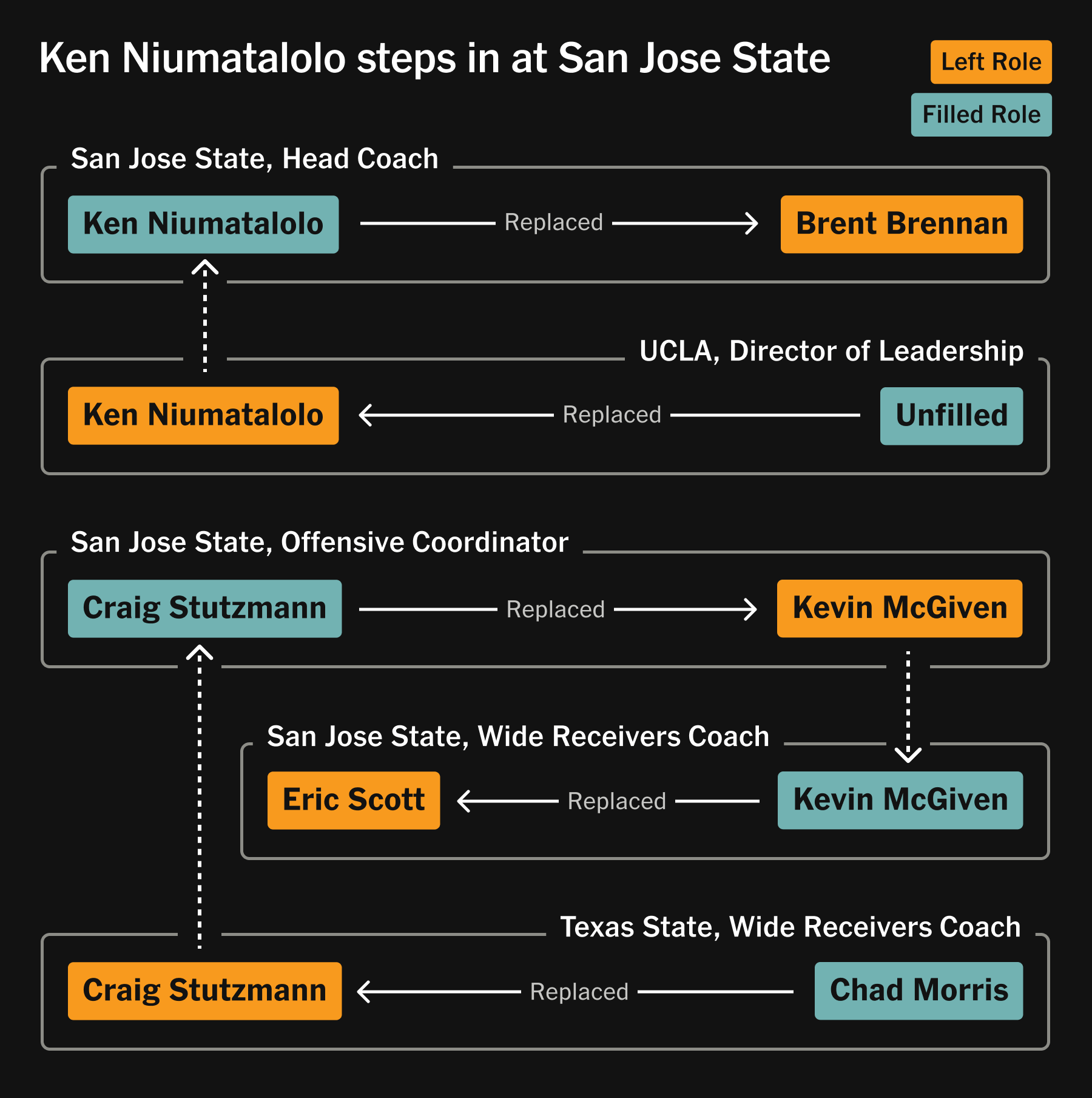 Arizona hired Brent Brennan and San Jose State hired Ken Niumatalolo to replace him. Coincidentally, he’d already met his new team four weeks earlier.