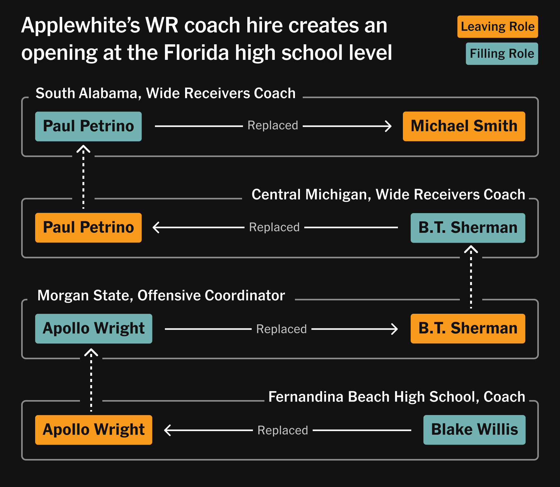 Applewhite hired Paul Petrino to coach South Alabama’s receivers. Central Michigan replaced him with B.T. Sherman from Morgan State, who then brought in Apollo Wright as its new offensive coordinator.