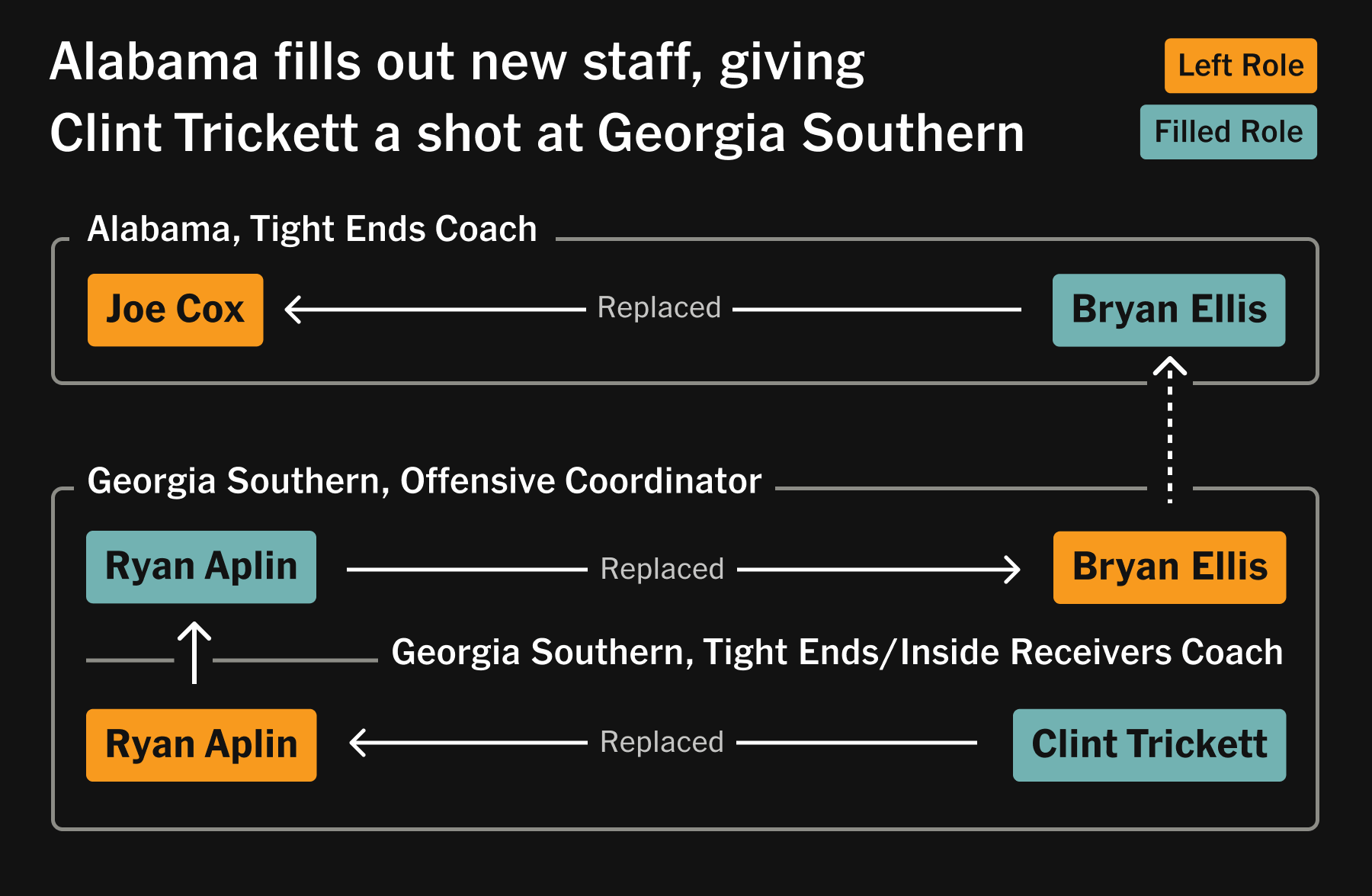 Clint Trickett was fortunate, too. Three months after being let go by Marshall, he was hired to coach inside receivers and tight ends at Georgia Southern. That spot came open after DeBoer hired Georgia Southern OC Bryan Ellis as Alabama’s tight ends coach. Ryan Aplin, who had the job Trickett was taking, got promoted to replace Ellis, who got looped in at Alabama by his old buddy from his Western Kentucky days, JaMarcus Shephard, DeBoer’s receivers coach at Washington that Saban had interviewed 10 minutes before he retired. Shepherd ended up in Tuscaloosa after all, as the Tide’s wide receivers coach.