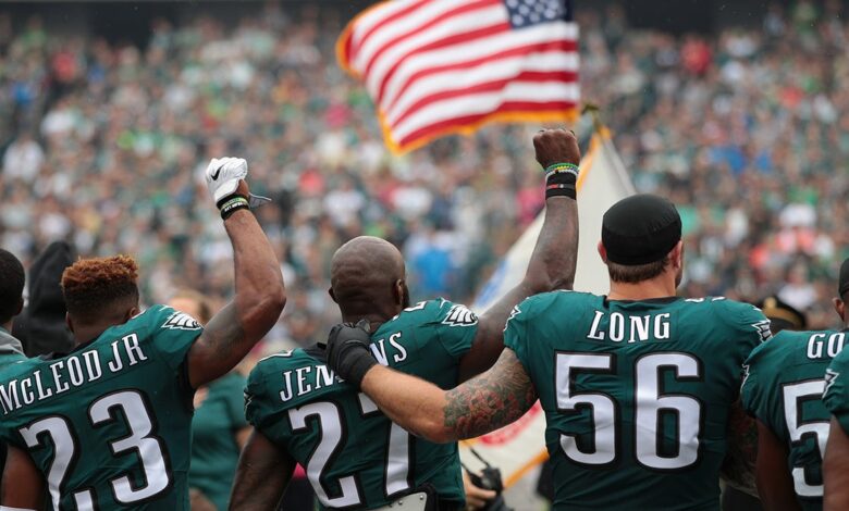 Rodney McLeod (23), Malcolm Jenkins (27) and Chris Long (56) of the Philadelphia Eagles stand during the national anthem during a 2017 game. The Global Sport Institute will study the impact of athlete activism. (Photo by Rich Schultz/Getty Images)