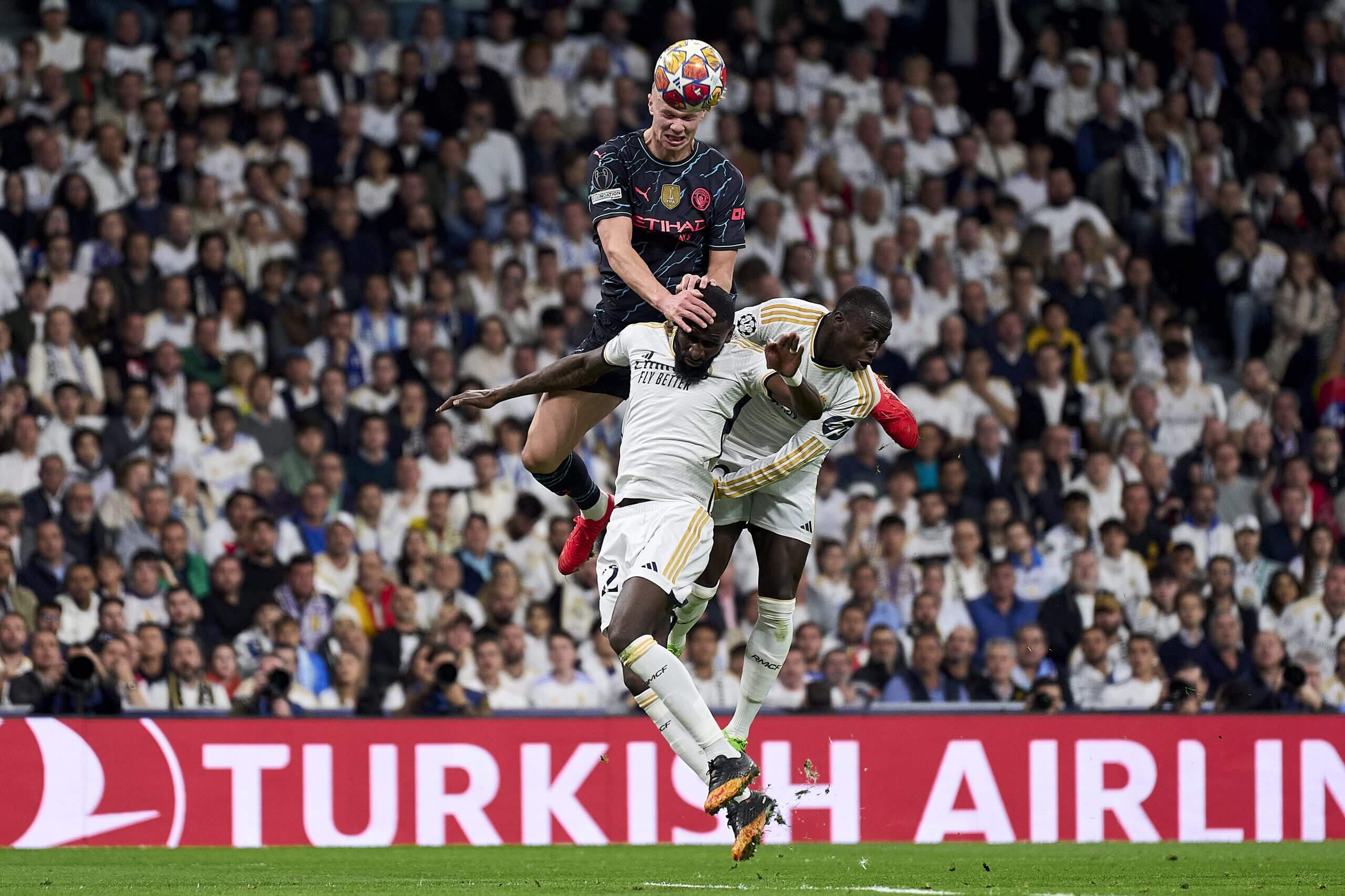 Haaland climbs above Rudiger and Ferland Mendy (Diego Souto/Getty Images)