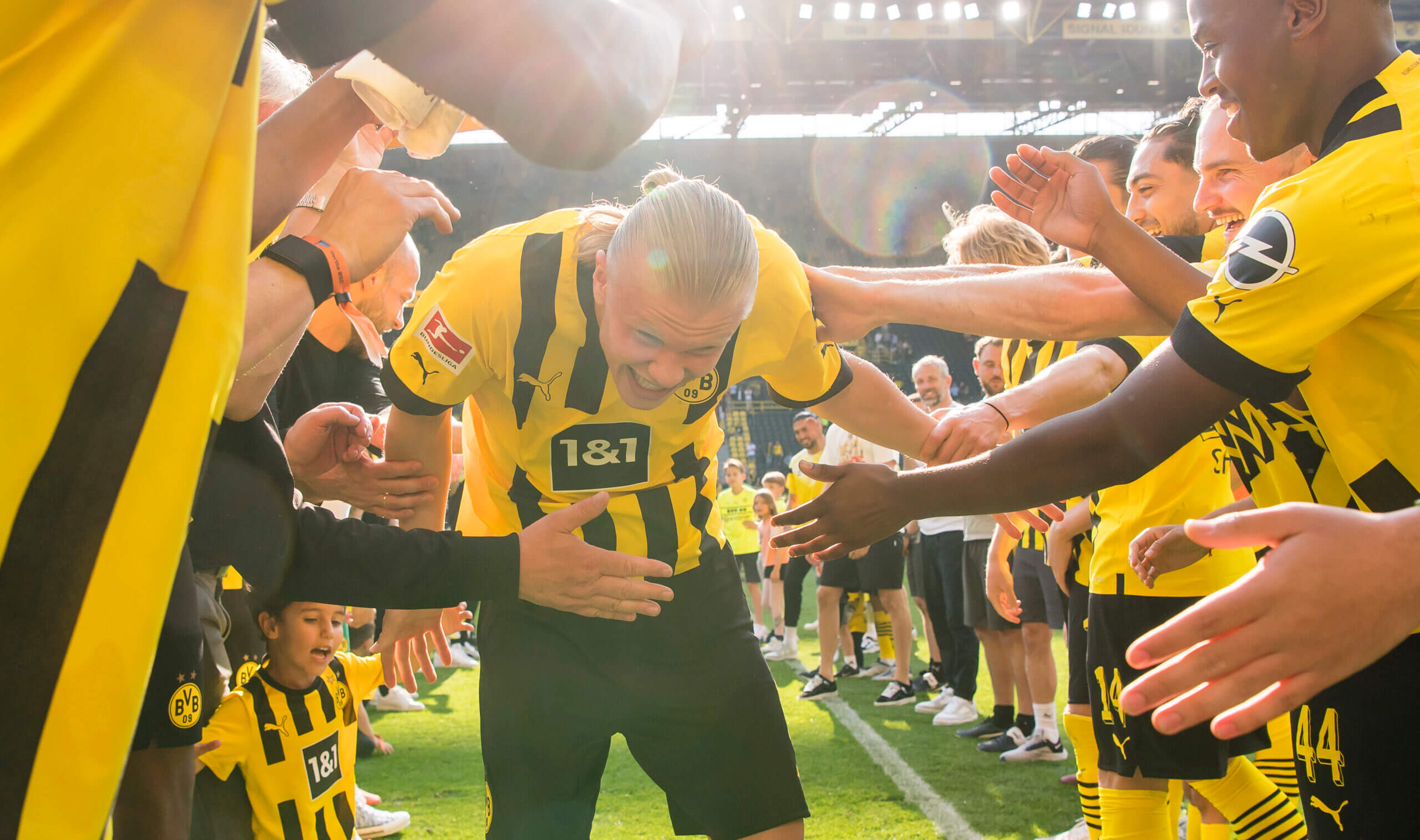 Haaland bidding farewell to his Dortmund team-mates before his move to Manchester City (Alexandre Simoes/Borussia Dortmund via Getty Images)