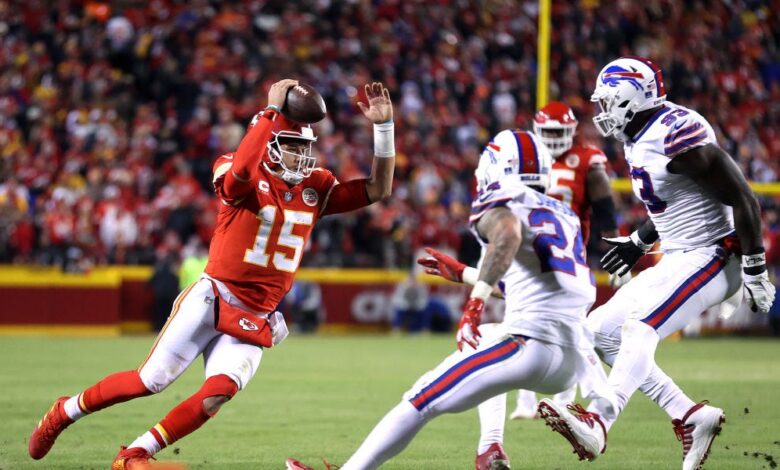 KANSAS CITY, MISSOURI – JANUARY 23: Patrick Mahomes #15 of the Kansas City Chiefs runs with the ball against the Buffalo Bills during the fourth quarter in the AFC Divisional Playoff game at Arrowhead Stadium on January 23, 2022 in Kansas City, Missouri. (Photo by Jamie Squire/Getty Images)