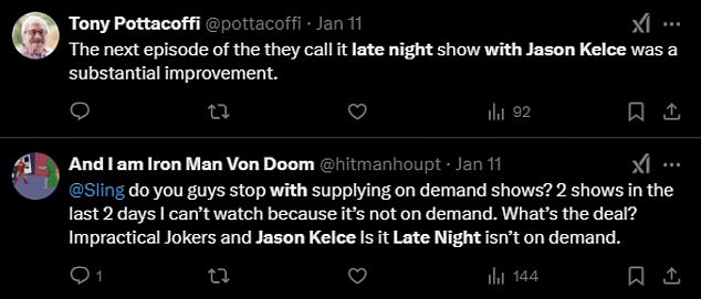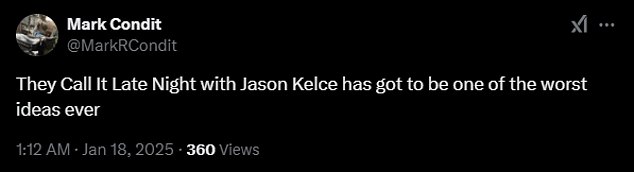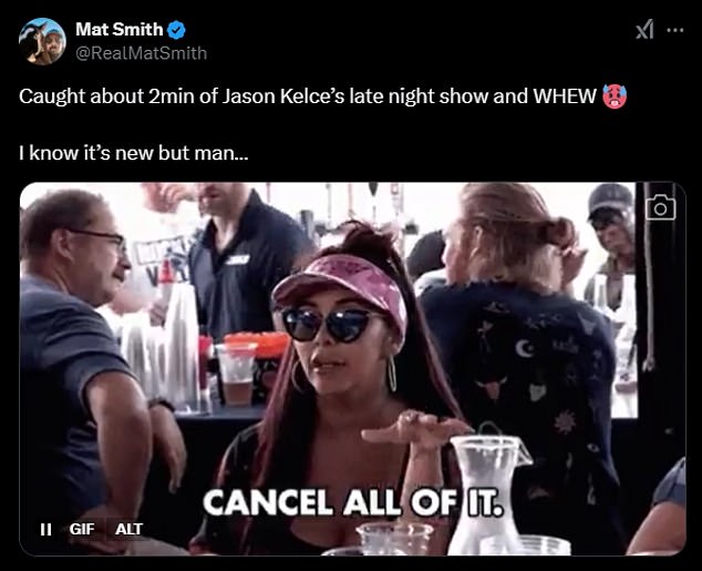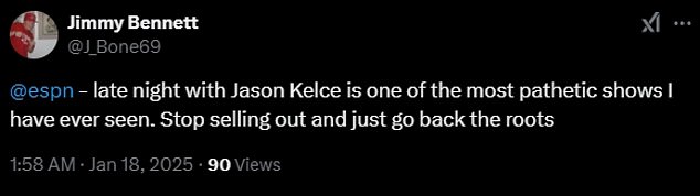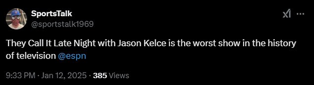 ‘Late night with Jason Kelce is one of the most pathetic shows I have ever seen,’ one angry fan wrote on X. ‘Stop selling out and just go back the roots.’
