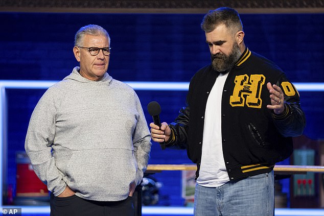 Former NFL player and ESPN analyst Jason Kelce, right, performs a skit with NFL Hall of Famer Harold Carmichael, left