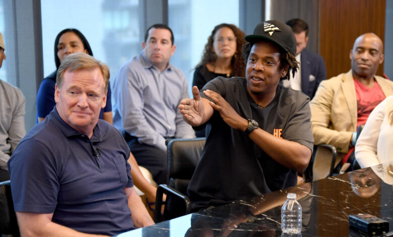 NFL commissioner Roger Goodell and Jay Z at Roc Nation’s Manhattan headquarters on August 14, announcing a partnership between the sports league and the rapper’s entertainment company.