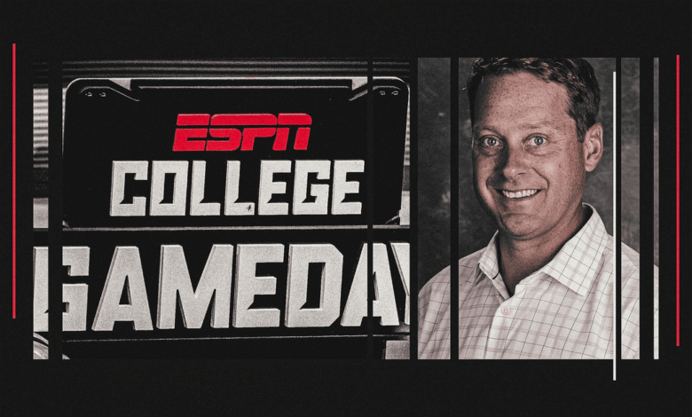 Fitting, a fraternity member while he attended James Madison University, graduated from ESPN’s production assistant program and became an associate producer on “College GameDay” in 2000 and was promoted to feature producer two years later. In the spring of 2004, he impressed his boss, Mark Gross, with a pitch for how he’d run the show. Fitting was put on smaller live shows that summer to hone his skills, and by that fall, at age 29, he was sitting in “College GameDay’s” lead chair.