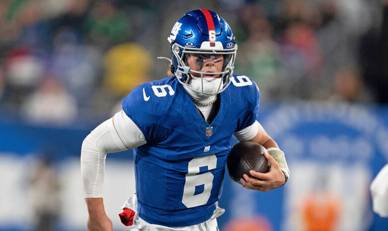 Photo By – Imagn Images. New York Giants quarterback Jaxson Dart (6) runs with the ball.
