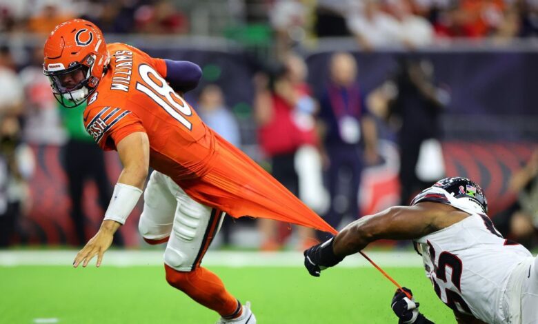 How can the offense better support Caleb Williams? At times, the No. 1 pick looked better in his second outing (two of his best passes came on Chicago’s lone scoring drive and were negated by a penalty and a drop by WR Rome Odunze). Williams finished 23-of-37 for 174 yards, no touchdowns, 2 interceptions and a 51.0 passer rating. The Bears had no answer to Houston’s blitz and failed to protect Williams, who was sacked seven times. After going 0-for-5 under pressure against the Titans, Williams was 2-of-9 for 20 yards with two interceptions while pressured against Houston.