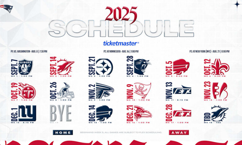 FOXBOROUGH, Mass. – The New England Patriots announced their 2025 season schedule tonight. Mike Vrabel will coach in his first regular season game as head coach of the Patriots on kickoff weekend when the Patriots host the Las Vegas Raiders on Sunday, Sept. 7 with a 1 p.m. kickoff.