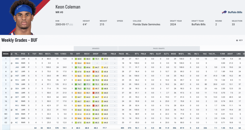 Coleman, the 33rd overall pick in 2024, amassed a 68.8 PFF receiving grade with 1.55 yards per route run in his inaugural season. Considering the Bills also traded for Amari Cooper in October, the fact that the former Florida State stud still finished second among Buffalo wideouts in targets is encouraging in and of itself.