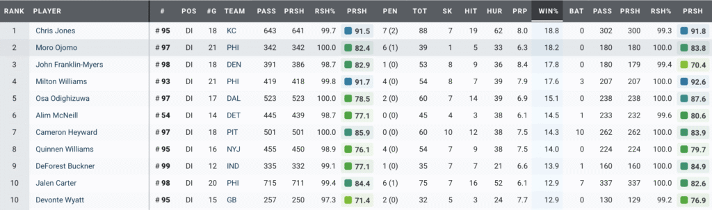 As part of Philadelphia’s Super Bowl-winning campaign, Ojomo quietly played a critical role in a deep interior defender rotation. The former seventh-round pick ended the season with an 82.4 PFF pass-rushing grade, including an 83.8 PFF pass-rushing grade on true pass sets. Each of those figures ranked top 11 among all defensive linemen, and his 18.2% pass-rush win rate was the second-best among qualifiers, trailing only Chris Jones.
