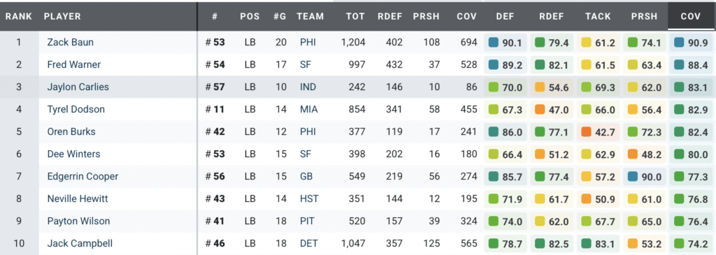 Indianapolis linebackers compiled the 20th-best overall PFF grade as a unit last year, with Carlies the best at a 70.0 mark. Over 242 snaps, the Maryland product registered an impressive 83.1 PFF coverage grade to go along with a solid 10.5% missed tackle rate.