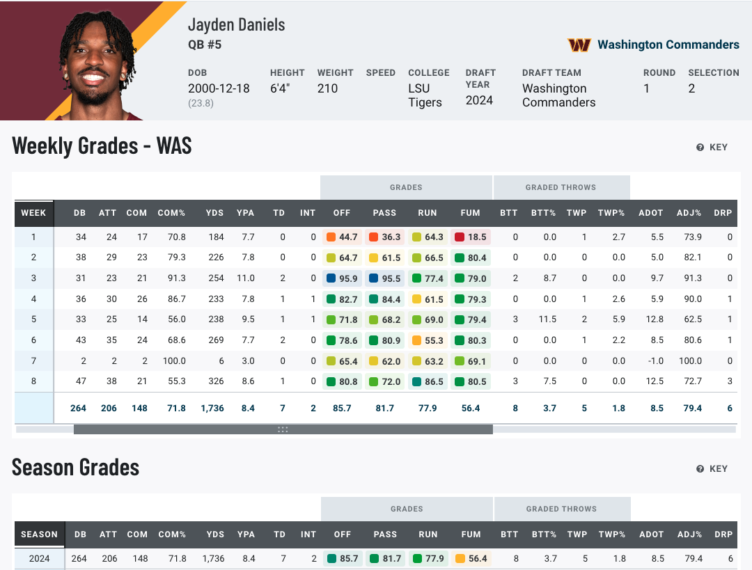• Jayden Daniels‘ legend grows: Daniels has excelled at protecting the football, posting just a 1.8% turnover-worthy play rate through eight weeks.