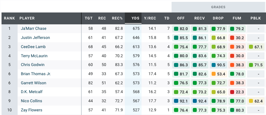 The Chargers’ second-round pick was arguably even more impressive than Alt this past week, as McConkey set career highs in PFF grade, receiving yards and yards per route run.