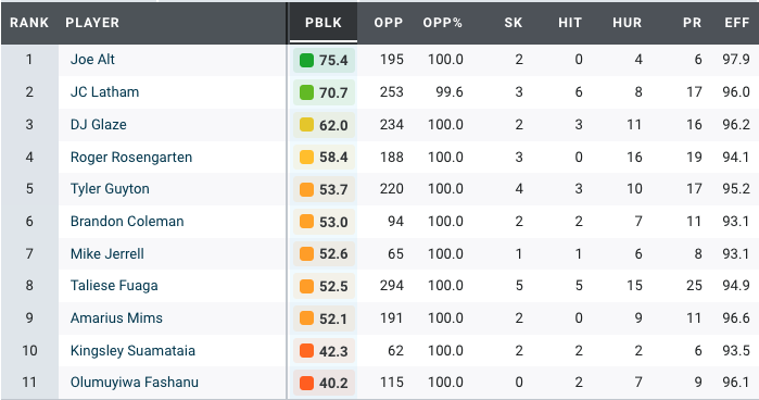 Frazier has missed the past two weeks with an ankle injury but currently ranks as the third-highest-graded center in the NFL this season. He’s been reliable in pass protection, allowing just four pressures on 206 pass-blocking snaps. He has been even better in the run game, as he has earned an 84.1 PFF run-blocking grade.