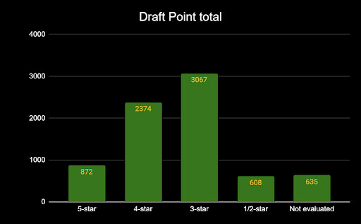Still, four and three-stars are far ahead of five stars in every round and have a huge advantage in draft points. Three-stars are also still significantly ahead of four-stars, so what is going on here? I would love to say we have uncovered something scandalous, but again, a huge piece of context is missing.