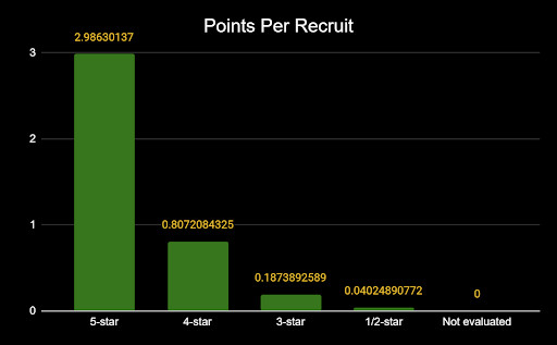 Based on my point allocation method, this is basically saying that the average five-star recruit over this time gained very close to three points, which means they were drafted in the late fifth-early sixth round. This may not sound impressive, until you consider that the average four-star was a long shot to be drafted at all, and the average player at other levels had virtually no shot. Now understandably, you may question the validity of my formula, but consider this.