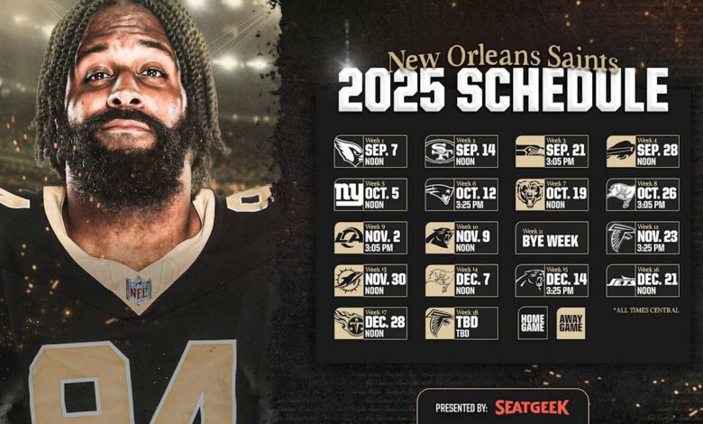Following the Falcons matchup, New Orleans will head to Florida for back-to-back matchups in the Sunshine State, starting when they face the Miami Dolphins on Nov. 30 (noon), followed by closing out their season series against Tampa Bay on Dec. 7 (noon). In Week 15, the Saints will host the Panthers on Sunday, Dec. 14 (3:25). The Black and Gold will then host the New York Jets on Dec. 21 (noon) in Week 16 to close out their 2025 regular season Caesars Superdome slate. New Orleans will finish the regular season with two straight road matchups, beginning at the Tennessee Titans on Dec. 28 (noon), followed by playing against the Falcons in Mercedes-Benz Stadium (date and time to be announced following conclusion of Week 17 contests). It is the first time since 2019 that the Saints will close out with two road games.