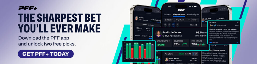 St. Brown’s 90.5 overall PFF grade is second among receivers in the NFL, and he’s caught 35 passes for 407 yards and six touchdowns through five weeks. McDuffie is one of the best cornerbacks in the NFL, as his 76.2 coverage grade ranks 12th. His four PBUs are the second-most in the NFL.