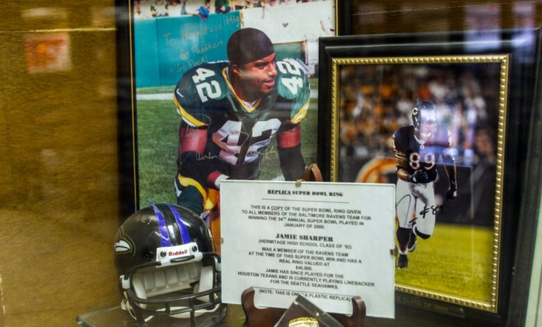 Sharper played 14 seasons in the NFL, making the Pro Bowl five times and winning a Super Bowl with the New Orleans Saints in 2010. Among the mementoes Allen keeps in his home are framed photographs of Sharper in uniform at Hermitage High, with the Packers and with the Minnesota Vikings, plus a letter from Sharper’s parents.