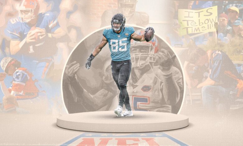 Tim Tebow’s NFL career ended with him trying to make the Jaguars’ roster as a 34-year-old tight end. (Photo by David Rosenblum/Icon Sportswire via Getty Images)