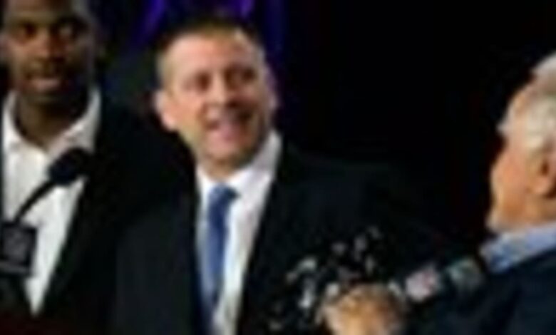 Steve Specht, center, talks with former NFL head coach Don Shula, right, after receiving the Don Shula NFL High School Coach of the Year award during an NFL Super Bowl XLVII news conference.