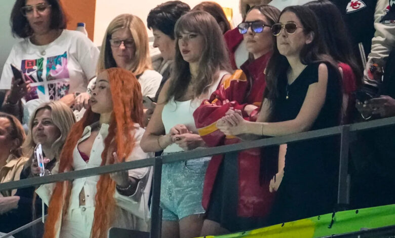 Swift isn’t watching the Super Bowl alone. The singer is joined in the suite by her friends Danielle and Alana Haim, Keleigh Teller and rapper Ice Spice, who was with her at last year’s game.