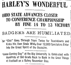 Harley was carried off the field after a 14-13 win against Wisconsin on Nov. 4, a victory that catapulted Ohio State to its first Western Conference championship. In the fourth quarter, Harley broke a 7-7 tie with an 80-yard punt return for a touchdown, described as “one of the most spectacular runs ever seen on Ohio Field” in The Columbus Dispatch.