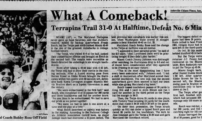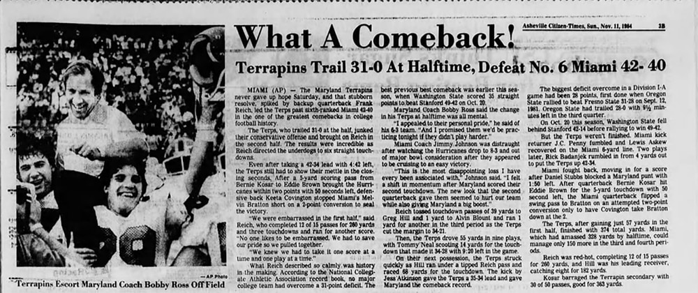 “The Maryland Terrapins never gave up hope Saturday, and that stubborn resolve, spiked by backup quarterback Frank Reich, led the Terps past sixth-ranked Miami 42-40 in one of the greatest comebacks in college football history,” reported the AP. “The Terps, who trailed 31-0 at the half, junked their conservative offense and brought on Reich in the second half. The results were incredible as Reich directed the underdogs to six straight touchdowns.”