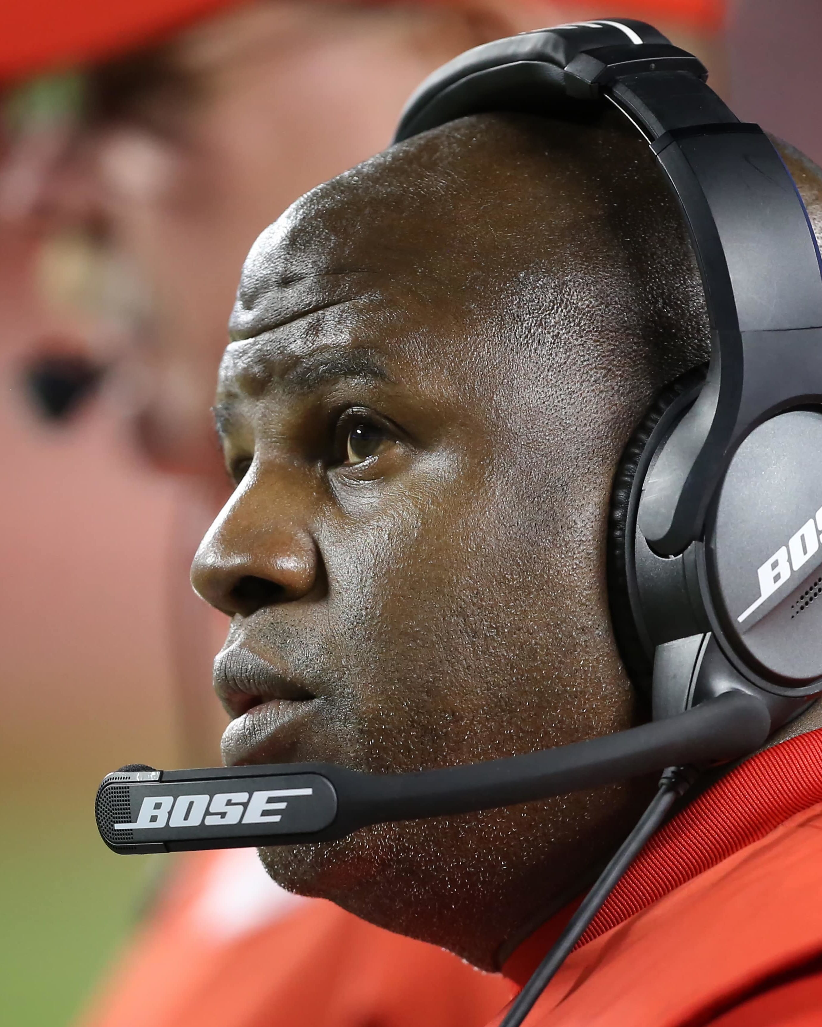 Chiefs OC Eric Bieniemy struck out multiple times this hiring cycle. He interviewed for the Dolphins, Jets, Buccaneers and Bengals jobs. (Photo by Scott Winters/Icon Sportswire via Getty Images)