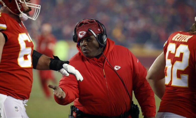 (Top photo of Kansas City Chiefs offensive coordinator Eric Bieniemy: Charlie Riedel/AP)