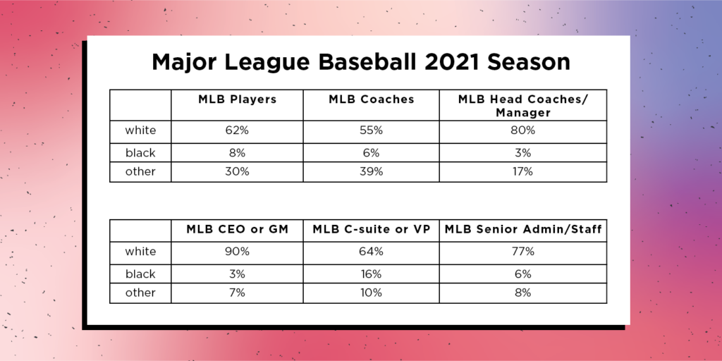 - 3% of MLB head coaches are Black in MLB, but because MLB has a considerably lower percentage of Black players, the small percentage of Black coaches/managers in baseball generally receives less public scrutiny.