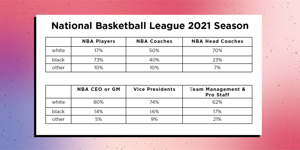 - Black players comprise 73% of the league, and 40% of all coaches, head and assistant. This gap of 33 percentage points is greater than the NFL’s gap of 22 points.